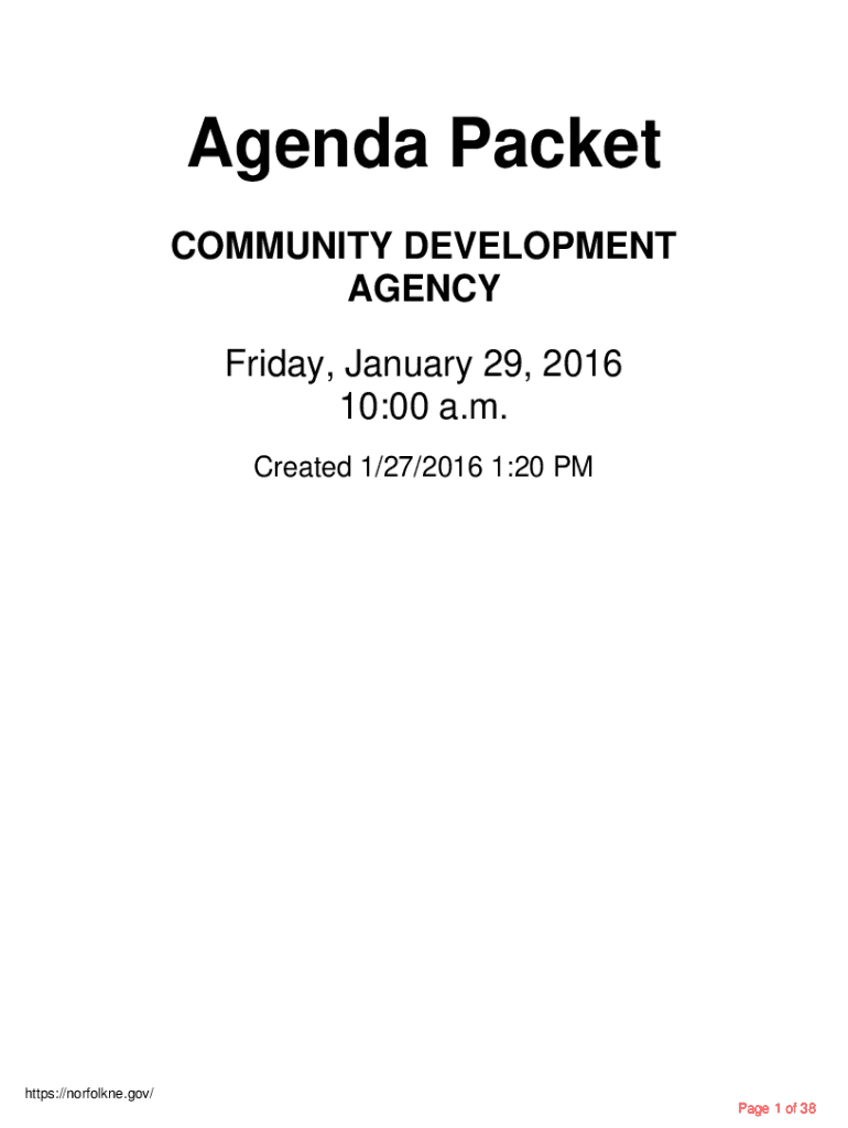 Agenda Packet COMMUNITY DEVELOPMENT AGENCY Friday, January 29, 2016 10:00 a.m. Created 1/27/2016 1:20 HTTPS://norfolkne.gov/ Page 1 of 38Notice of Meeting Community Development Agency The Community