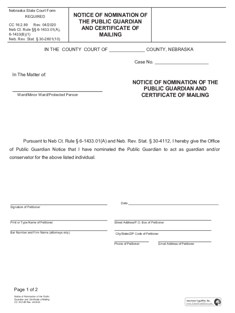 Nebraska State Court Form REQUIRED CC 16:2.89 Rev. Neb Ct. Rule 61433.01(A), 61433(B)(1) Neb. Rev. Stat. 302601(10)NOTICE OF NOMINATION OF THE PUBLIC GUARDIAN AND CERTIFICATE OF MAILING IN THE COUNTY