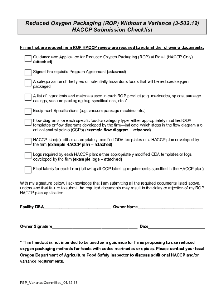 Reduced Oxygen Packaging (TOP) Without a Variance (3502.12) HACCP Submission Checklist Firms that are requesting a TOP HACCP review are required to submit the following documents: Guidance and Application