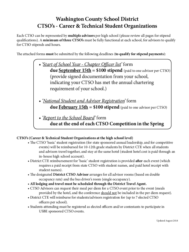 Washington County School District CT SOs Career & Technical Student Organizations Each CTO can be represented by multiple advisors per high school (please review all pages for stipend qualifications).