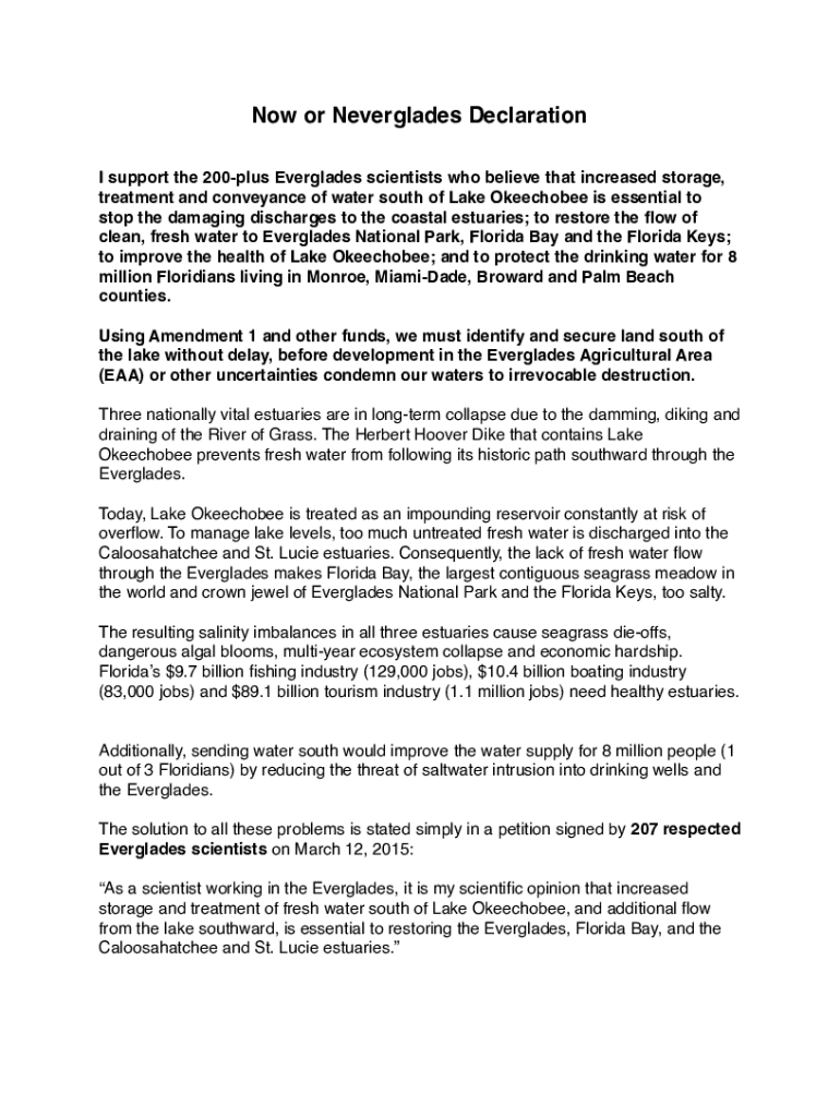 Now or Everglades Declaration I support the 200plus Everglades scientists who believe that increased storage, treatment and conveyance of water south of Lake Okeechobee is essential to stop the damaging