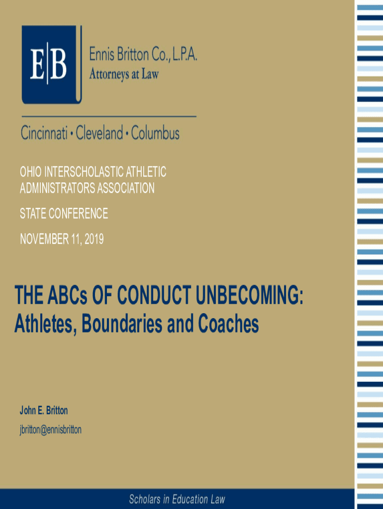 OHIO INTERSCHOLASTIC ATHLETIC ADMINISTRATORS ASSOCIATION STATE CONFERENCE NOVEMBER 11, 2019THE ABCs OF CONDUCT UNBECOMING: Athletes, Boundaries and Coaches John E. Britton jbritton@ennisbrittonGOALS