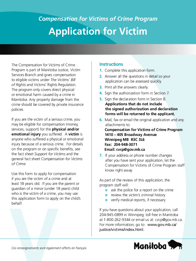 Compensation for Victims of Crime ProgramApplication for Victimize Compensation for Victims of Crime Program is part of Manitoba Justice, Victim Services Branch and gives compensation to eligible