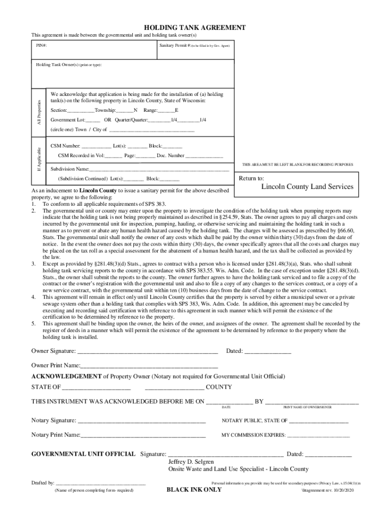 Get the free Document Number Document Title HOLDING TANK AGREEMENT - co lincoln wi