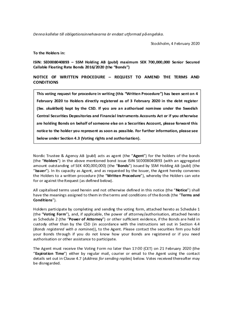 Donna allele till obligationsinnehavarna r east unformed p Engels. Stockholm, 4 February 2020 To the Holders in: ISIN: SE0008040893 SSM Holding AB (pub) maximum SEK 700,000,000 Senior Secured Callable