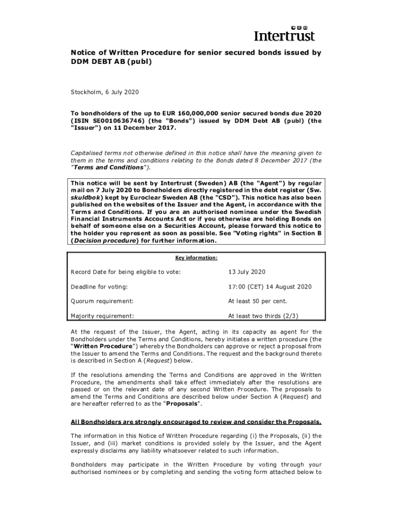 Notice of Written Procedure for senior secured bonds issued by DDM DEBT AB (pub)Stockholm, 6 July 2020 To bondholders of the up to EUR 160,000,000 senior secured bonds due 2020 (ISIN SE0010636746)
