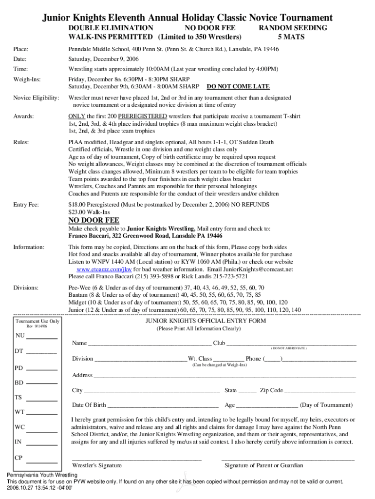 Junior Knights Eleventh Annual Holiday Classic Novice Tournament DOUBLE ELIMINATION NO DOOR FEE WALKING PERMITTED (Limited to 350 Wrestlers)RANDOM SEEDING 5 Misplace:Penn dale Middle School, 400 Penn