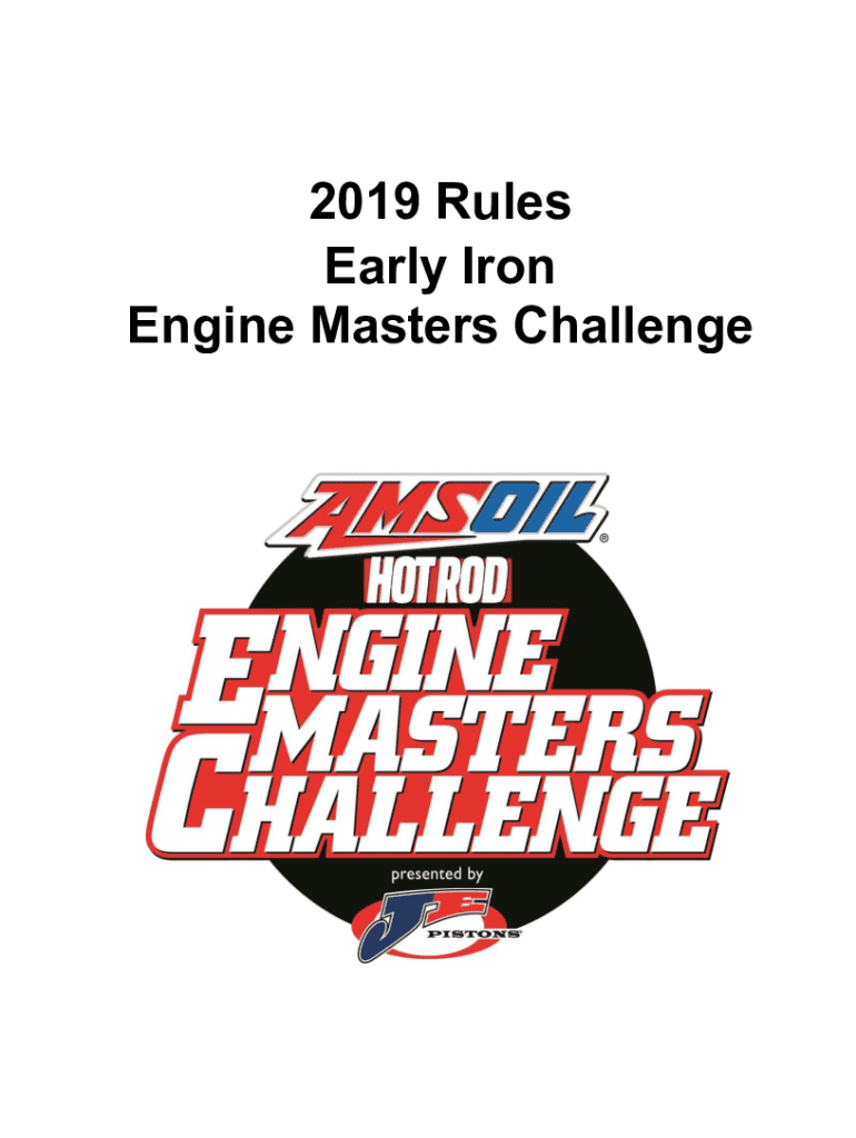 2019 Rules Early Iron Engine Masters ChallengeEarly Nontechnical RULES Section 300 (NOTE: This class will use a cubic inch divider in scoring to compensate for varied engine displacement. Scoring