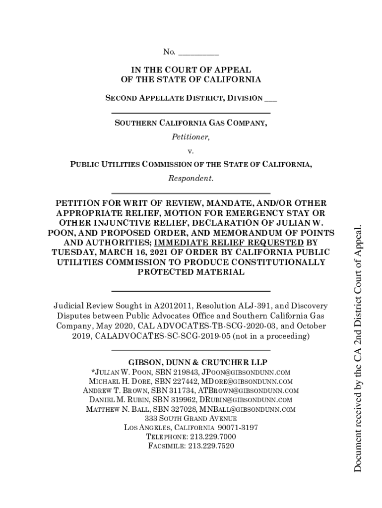 No. IN THE COURT OF APPEAL OF THE STATE OF CALIFORNIA SECOND APPELLATE DISTRICT, DIVISION SOUTHERN CALIFORNIA GAS COMPANY, Petitioner, v. PUBLIC UTILITIES COMMISSION OF THE STATE OF CALIFORNIA, PETITION