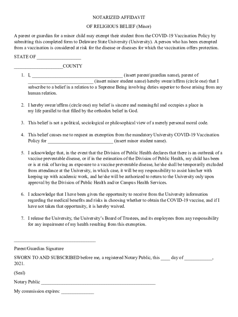 NOTARIZED AFFIDAVIT OF RELIGIOUS BELIEF (Minor) A parent or guardian for a minor child may exempt their student from the COVID-19 Vaccination Policy by submitting this completed form to Delaware State