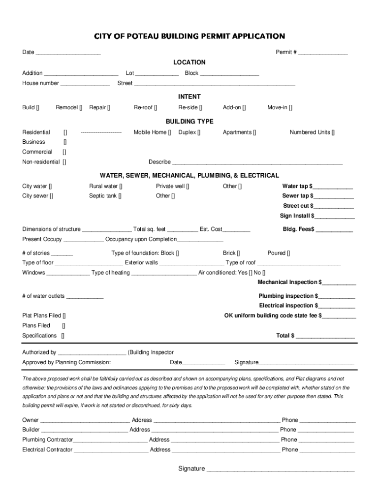 Date Permit # LOCATION Addition House number Lot Block Street INTENT Build Remodel Repair Reproof Reside Add-on Moran BUILDING TYPE Residential Business Commercial Nonresidential Mobile Home Duplex