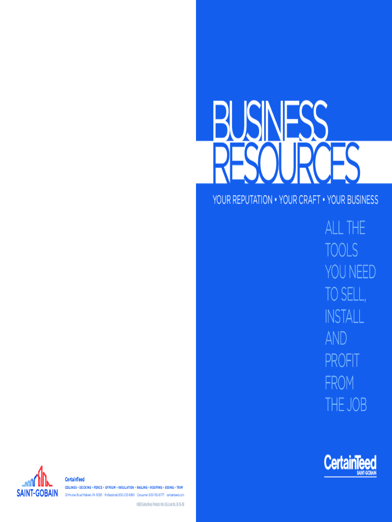 BUSINESS RESOURCESYour Reputation Your Craft YOUR Business The Tools You Need To Sell, Install And Profit From The JobCertainTeed CEILINGS DECKING FE NCE GYPSY M INSU L ACTION R AILING ROOFING SIDING