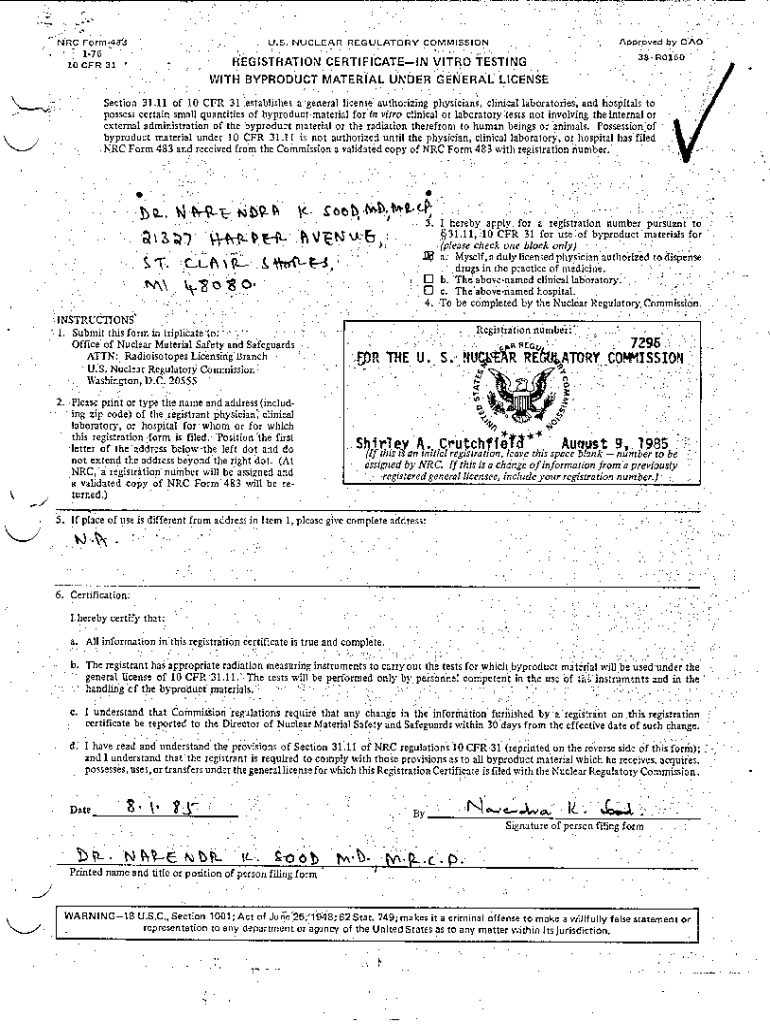 77IRC Form.48:3 1876 8 10 CFR 31U. S. NUCLEAR REGULATORY COMMISSIONApprove\' I buy REGISTRATION CERTIFICATE IN VITO TESTING WITH BYPRODUCT MATERIAL UNDER GENERAL LICENSEt0160 38 F. V, 1. Section 31.11
