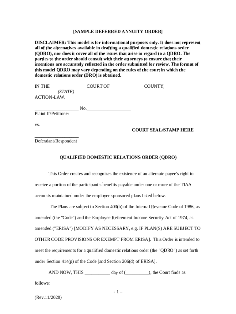 Deferred Annuity (DA) Sample QDRO. This QDRO should be used for all Employer Sponsored Retirement Plans including all Minimum Distribution (MDO), Transfer Payout Annuity (TPA) and Interest Only contracts (IO) template instructions