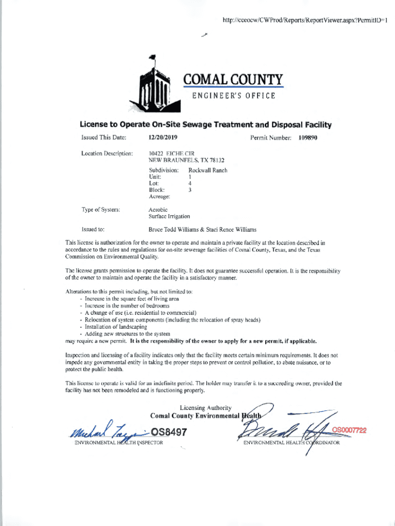 Permit of Authorization to Construct an Onsite Sewage Facility Permit Valid For One Year From Date IssuedPermit Number:109890Issued This Date:10/25/2019This permit is hereby given to:Bruce Todd Williams