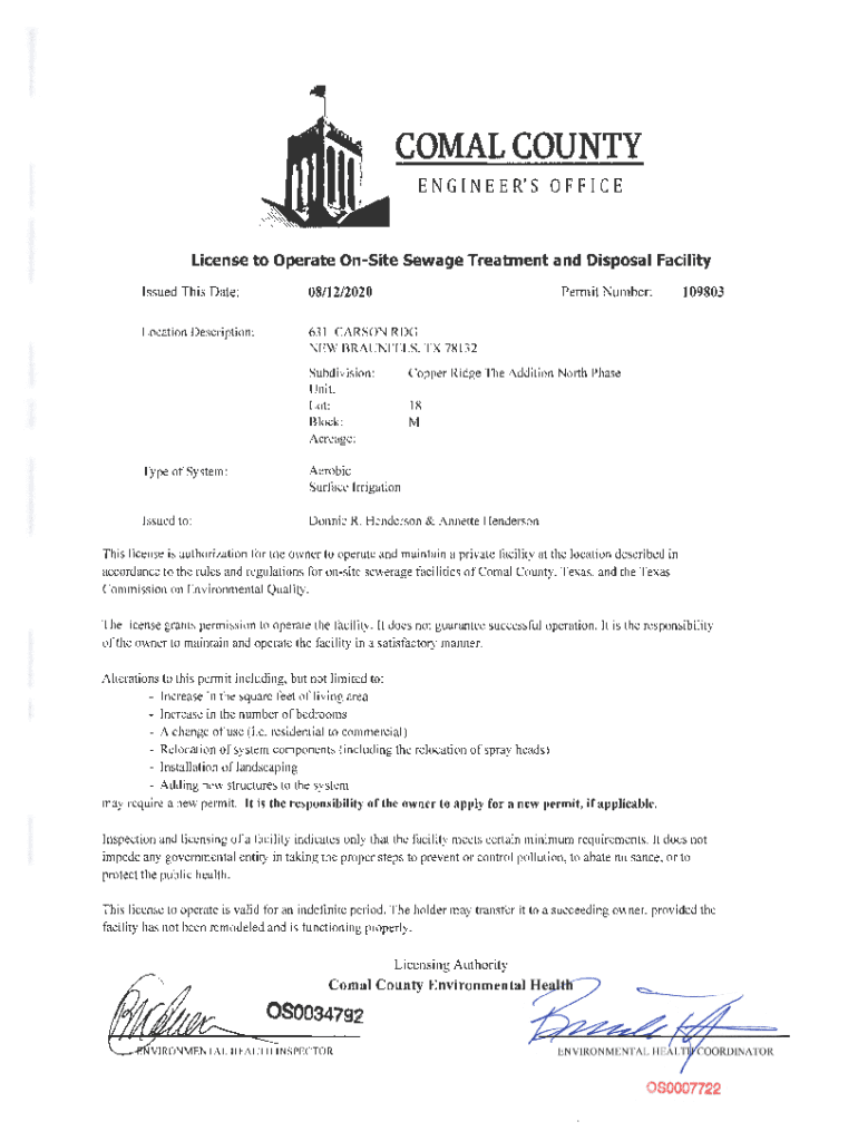 COAL COUNTY E N GI N E E R S 0 F I License to Operate Onsite Sewage Treatment and Disposal Facility Issued This Date:08/12/2020Penn it Number:Location Description:63 1 CARSON RPG NEW BRAUNFELS, TX