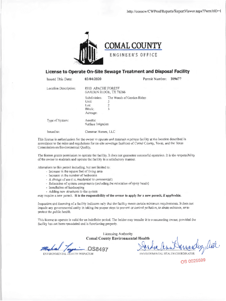 Permit of Authorization to Construct an Onsite Sewage Facility Permit Valid For One Year From Date IssuedPermit Number:109477Issued This Date:08/01/2019This permit is hereby given to:Caesar Homes,