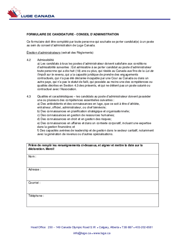 FORMULA IRE DE CANDIDATURE CONSENT ADMINISTRATION Ce formula ire dot TRE comply par route personnel quit suite SE porter candidate(e) UN post AU San Du Conrail administration DE Luge Canada. Election
