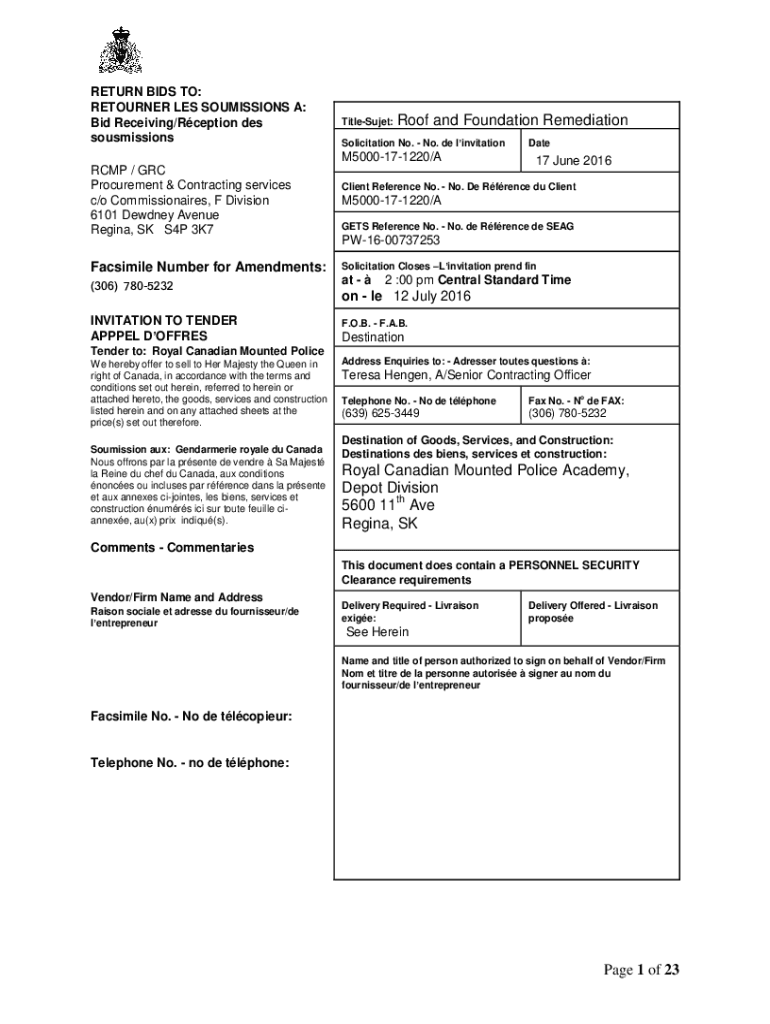 RETURN BIDS TO: RETURNER LES COMMISSIONS A: Bid Receiving/Reception DES sousmissionsTitleSujet:Roof and Foundation RemediationSolicitation No. No. de linvitationM5000171220/A RCMP / GRC Procurement