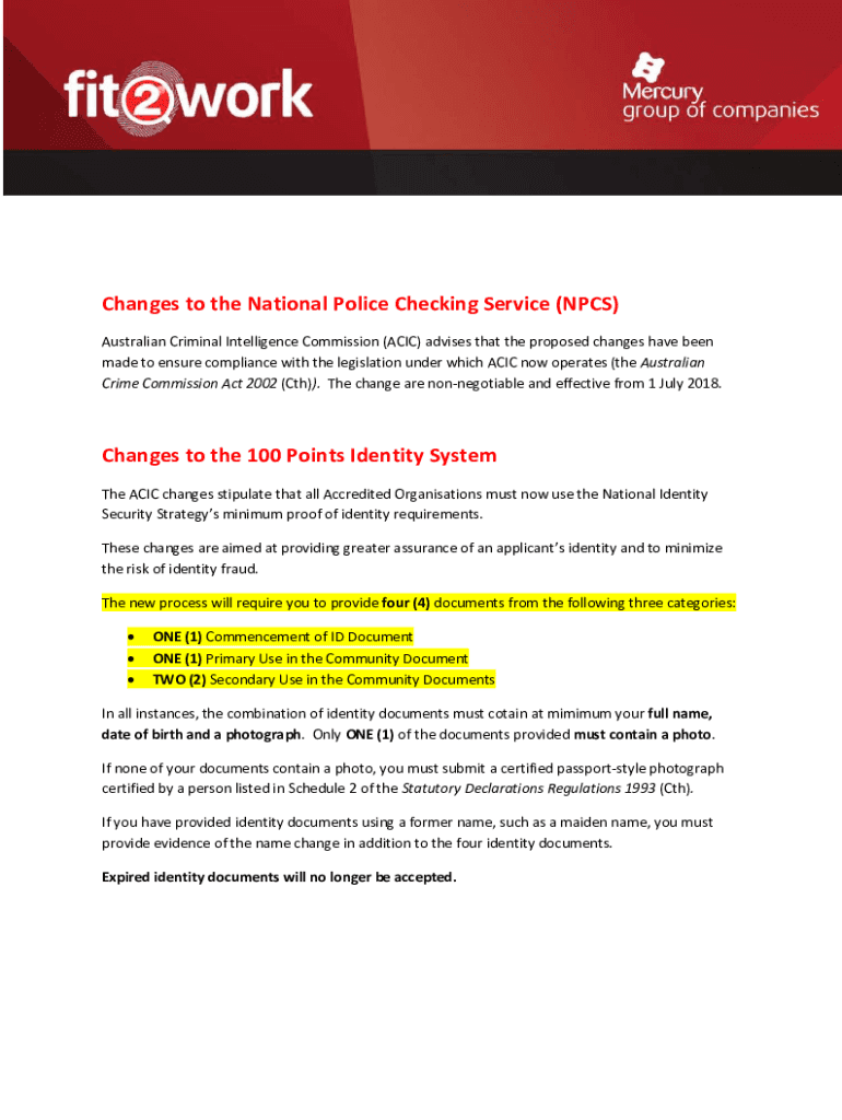 Changes to the National Police Checking Service (NPCs) Australian Criminal Intelligence Commission (ACID) advises that the proposed changes have been made to ensure compliance with the legislation