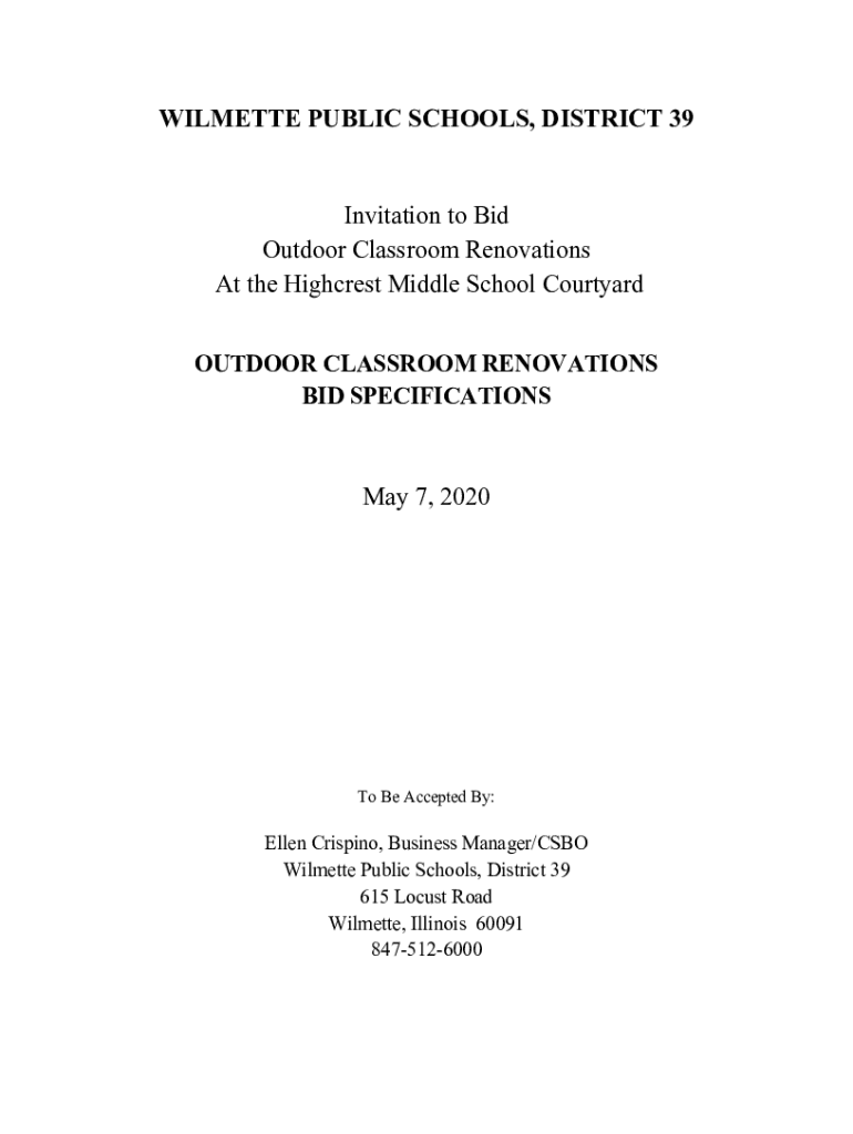 WILMETTE PUBLIC SCHOOLS, DISTRICT 39Invitation to Bid Outdoor Classroom Renovations At the High crest Middle School Courtyard OUTDOOR CLASSROOM RENOVATIONS BID SPECIFICATIONS May 7, 2020To Be Accepted