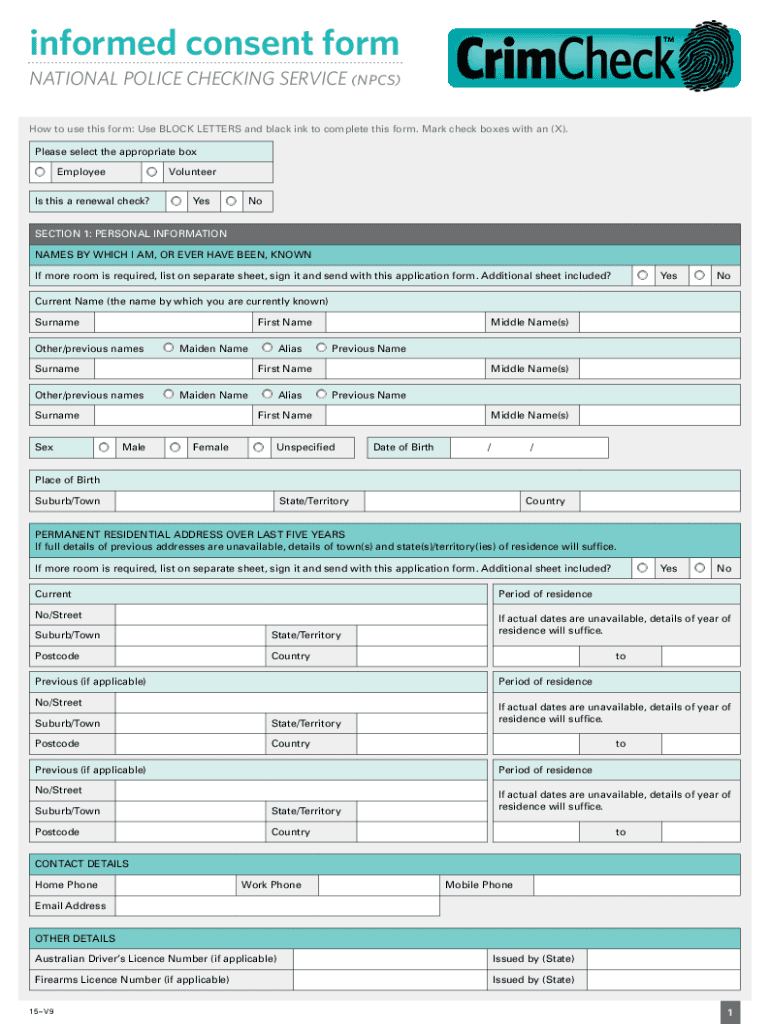 Informed consent form national police checking service (NPCs) How to use this form: Use BLOCK LETTERS and black ink to complete this form. Mark check boxes with an (X). Please select the appropriate