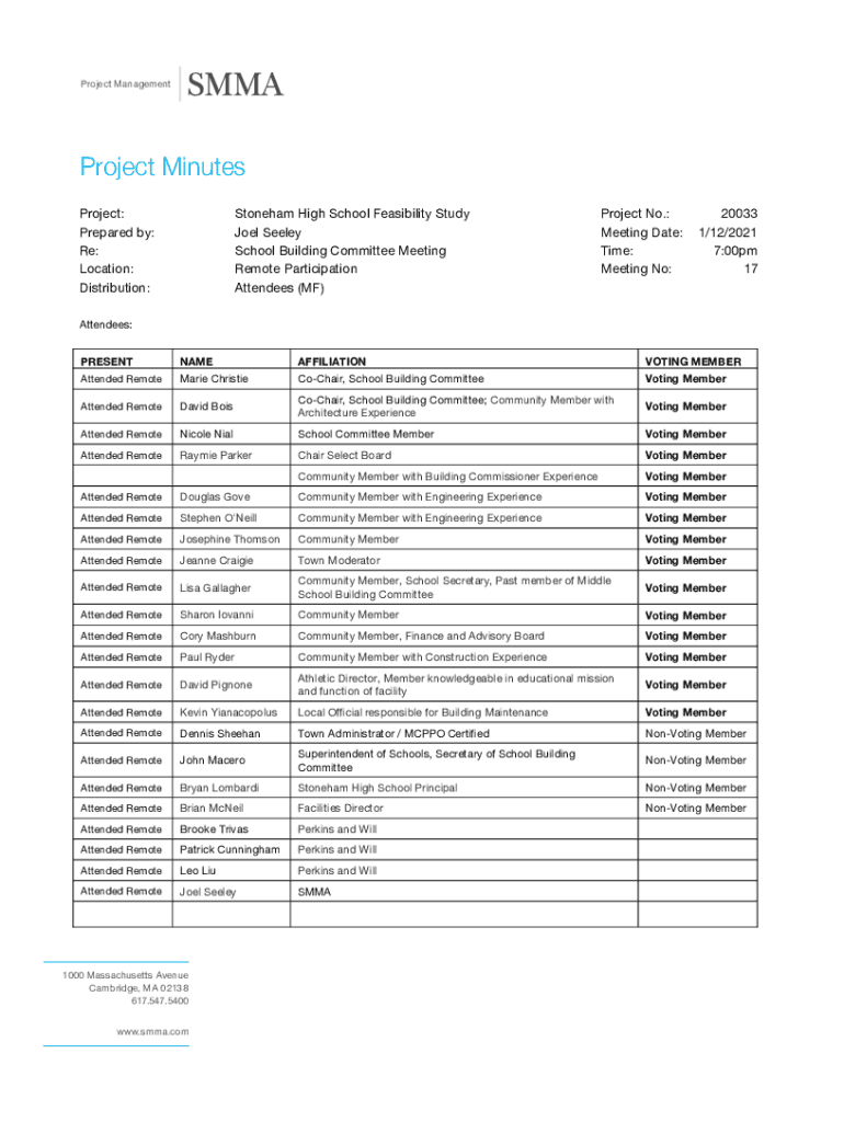 Project ManagementProject Minutes Project: Prepared by: Re: Location: Distribution:Stone ham High School Feasibility Study Joel Seemed School Building Committee Meeting Remote Participation Attendees