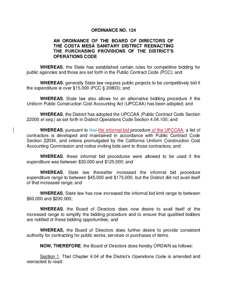 ORDINANCE NO. 124 AN ORDINANCE OF THE BOARD OF DIRECTORS OF THE COSTA MESA SANITARY DISTRICT REENACTING THE PURCHASING PROVISIONS OF THE DISTRICTS OPERATIONS CODE WHEREAS, the State has established