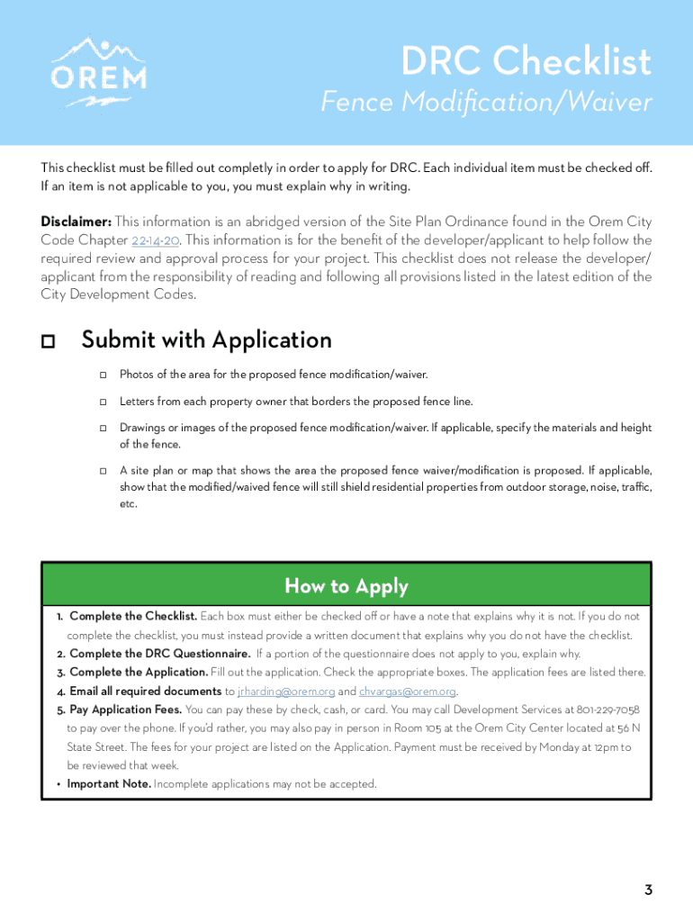The Orem City DRC packet can be filled out by providing all required forms, documentation, and information as outlined in the packet guidelines.