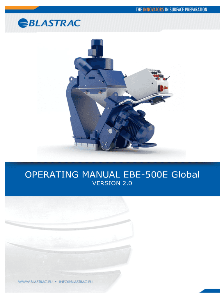 OPERATING MANUAL EBE500E Global VERSION 2.0EC DECLARATION OF CONFORMITY in accordance with Appendix II sub A of Directive 2006/42/ECBLASTRAC B.V. Utrecht haven 12 NL 3433 IN NIEUWEGEIN Tel: 0031 (0)30
