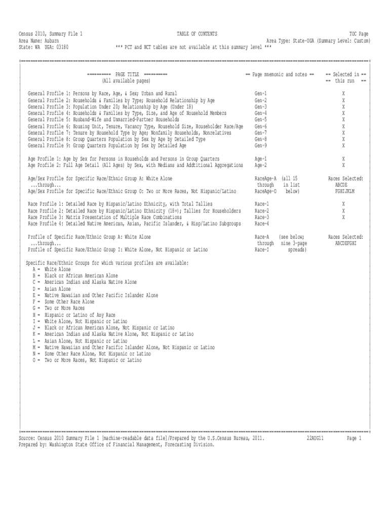 Census 2010, Summary File 1 Area Name: Auburn State: WA UGA: 03180TABLE OF CONTENTS Page Area Type: State UGA (Summary Level: Custom) *** PCT and HCT tables are not available at this summary level