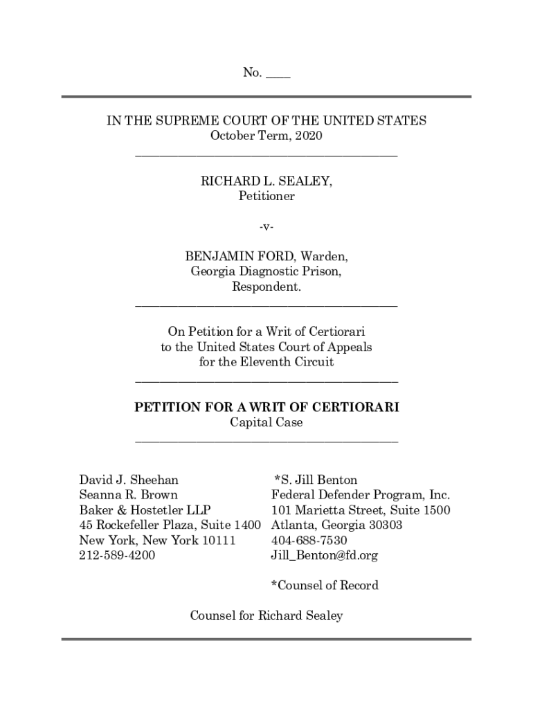 No. IN THE SUPREME COURT OF THE UNITED STATES October Term, 2020 RICHARD L. SEALED, Petitioner Benjamin FORD, Warden, Georgia Diagnostic Prison, Respondent. On Petition for a Writ of Certiorari to
