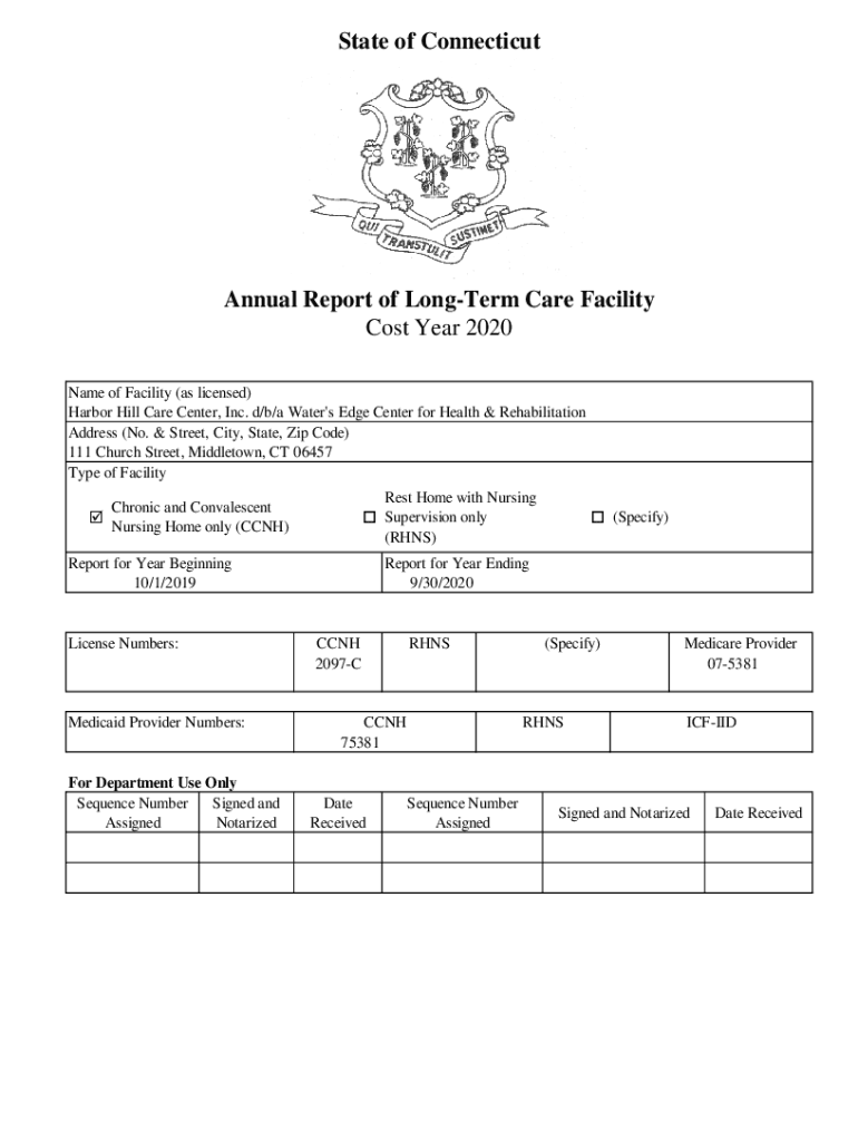 State of Connecticut 2020Annual Report of Longer Care Facility Cost Year 2020 Name of Facility (as licensed) Harbor Hill Care Center, Inc. d/b/a Water's Edge Center for Health & Rehabilitation Address