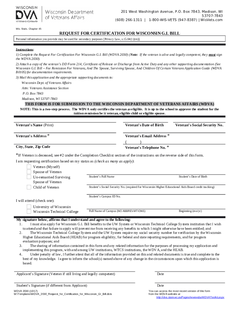The Bill (WDVA 2030) (Note:If the veteran is alive and legally competent, they must sign the WDVA 2030) is a fillable form in MS Word extension which can be completed and signed for certain needs. In that case, it is furnished to the actual addressee in order to provide some info of any kinds. The completion and signing is able manually or with a trusted solution e. g. PDFfiller. These tools help to submit any PDF or Word file without printing them out. It also lets you customize it according to the needs you have and put a valid electronic signature. Upon finishing, the user sends the Bill (WDVA 2030) (Note:If the veteran is alive and legally competent, they must sign the WDVA 2030) to the respective recipient or several ones by email and even fax. PDFfiller has got a feature and options that make your Word form printable. It has various settings for printing out appearance. No matter, how you send a form - physically or by email - it will always look neat and firm. To not to create a new editable template from the beginning over and over, make the original Word file as a template. Later, you will have an editable sample.