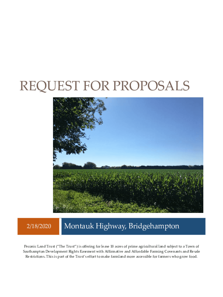 REQUEST FOR PROPOSALS2/18/2020Montauk Highway, BridgehamptonPeconic Land Trust (The Trust) is offering for lease 18 acres of prime agricultural land subject to a Town of Southampton Development Rights