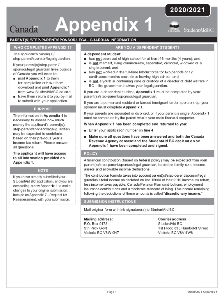 Students who are seeking financial aid for post-secondary education in Canada are required to file appendix 1 - studentaidbcca.