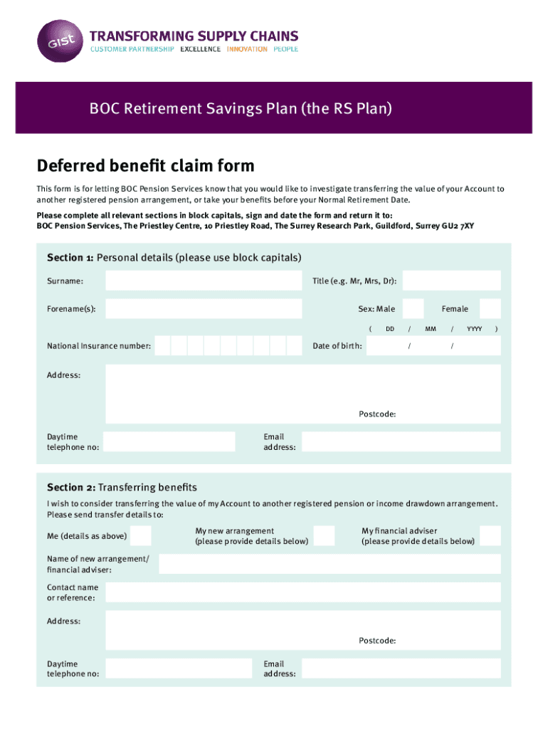 BOC Retirement Savings Plan (the RS Plan)Deferred benefit claim from This form is for letting BOC Pension Services know that you would like to investigate transferring the value of your Account to