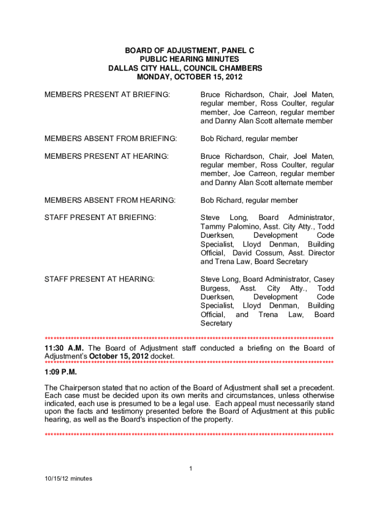 BOARD OF ADJUSTMENT, PANEL C PUBLIC HEARING MINUTES DALLAS CITY HALL, COUNCIL CHAMBERS MONDAY, OCTOBER 15, 2012, MEMBERS PRESENT AT BRIEFING:Bruce Richardson, Chair, Joel Mate, regular member, Ross
