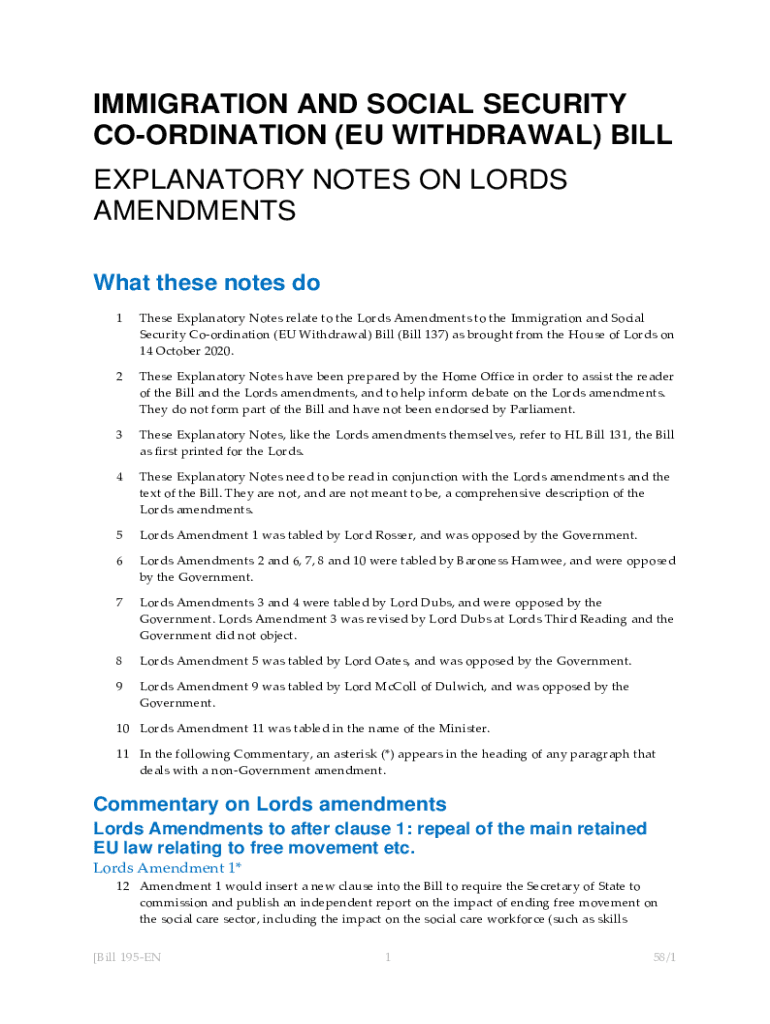 IMMIGRATION AND SOCIAL SECURITY COORDINATION (EU WITHDRAWAL) BILL EXPLANATORY NOTES ON LORDS AMENDMENTS What these notes do 1These Explanatory Notes relate to the Lords Amendments to the Immigration
