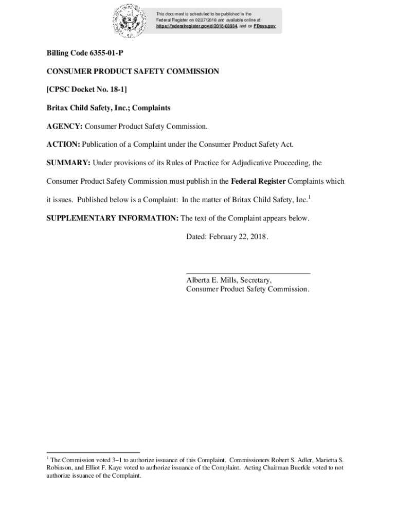 This document is scheduled to be published in the Federal Register on 02/27/2018 and available online at https://federalregister.gov/d/201803934, and on Days. Billing Code 635501P CONSUMER PRODUCT