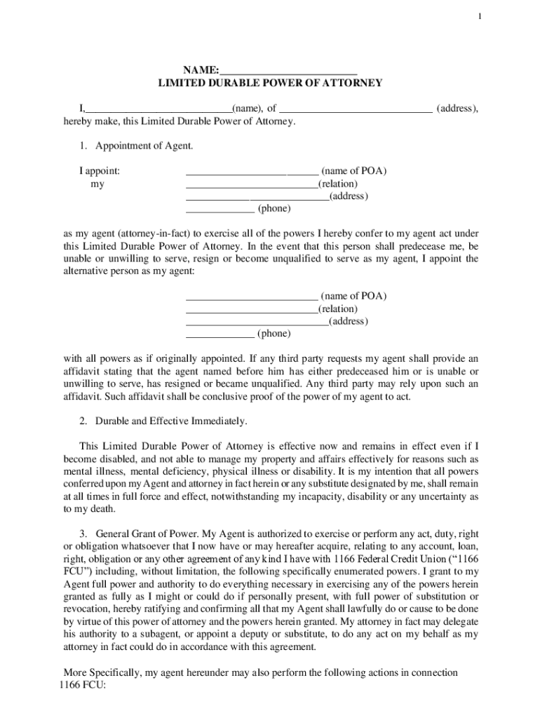 1NAME: LIMITED DURABLE POWER OF ATTORNEY I, (name), of (address), hereby make, this Limited Durable Power of Attorney. 1. Appointment of Agent. I appoint: my (name of POA) (relation) (address) (phone)as
