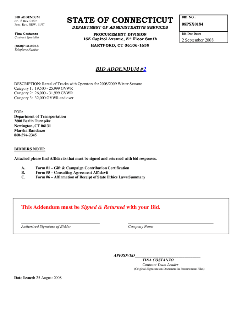 BID ADDENDUM SP18 Rev. 05/07 Prey. Rev. NEW. 11/97STATE OF CONNECTICUT DEPARTMENT OF ADMINISTRATIVE SERVICES Tina Costansó Contract SpecialistPROCUREMENT DIVISION 165 Capitol Avenue, 5th Floor South(860)7135068