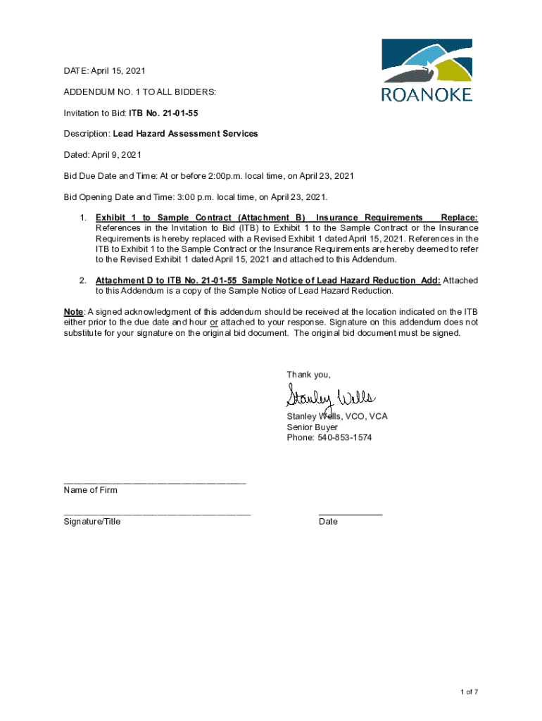 DATE: April 15, 2021, ADDENDUM NO. 1 TO ALL BIDDERS: Invitation to Bid: ITB No. 210155 Description: Lead Hazard Assessment Services Dated: April 9, 2021, Bid Due Date and Time: At or before 2:00p.m.
