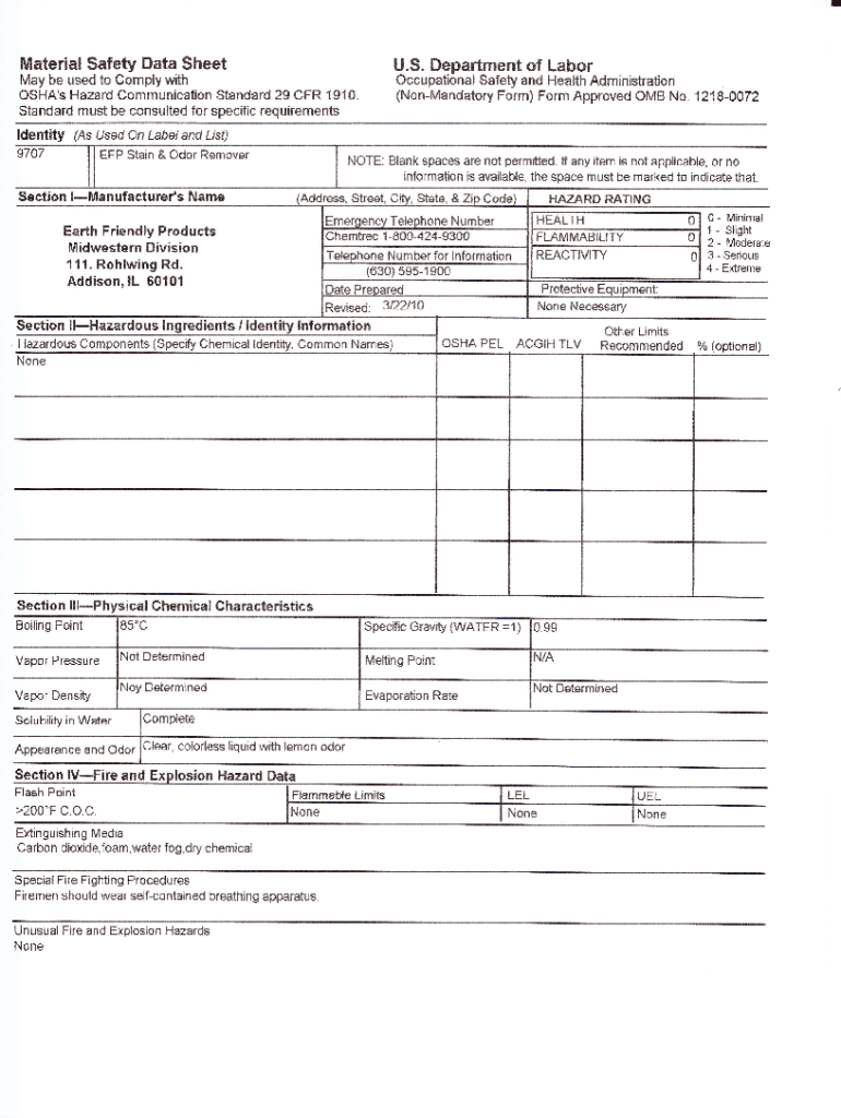 Material Safety Data Sheet, S. Department of Labor Occupational Safety May be used to Complywitha ND Health Ad ministration (NonMandatory Form) Form Approved OMB No. 12180072OSHA's Hazard Communication