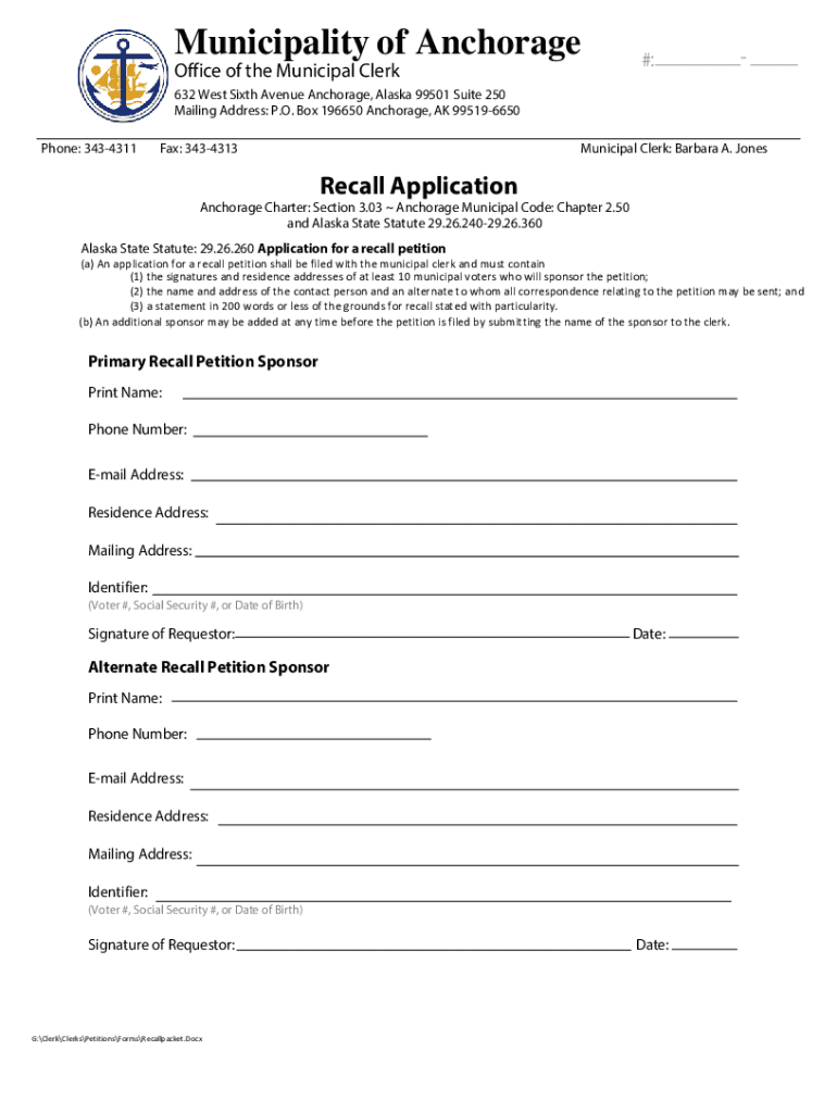 Municipality of Anchorage Office of the Municipal Clerk#:632 West Sixth Avenue Anchorage, Alaska 99501 Suite 250 Mailing Address: P.O. Box 196650 Anchorage, AK 995196650 Phone: 3434311Fax: 3434313Municipal