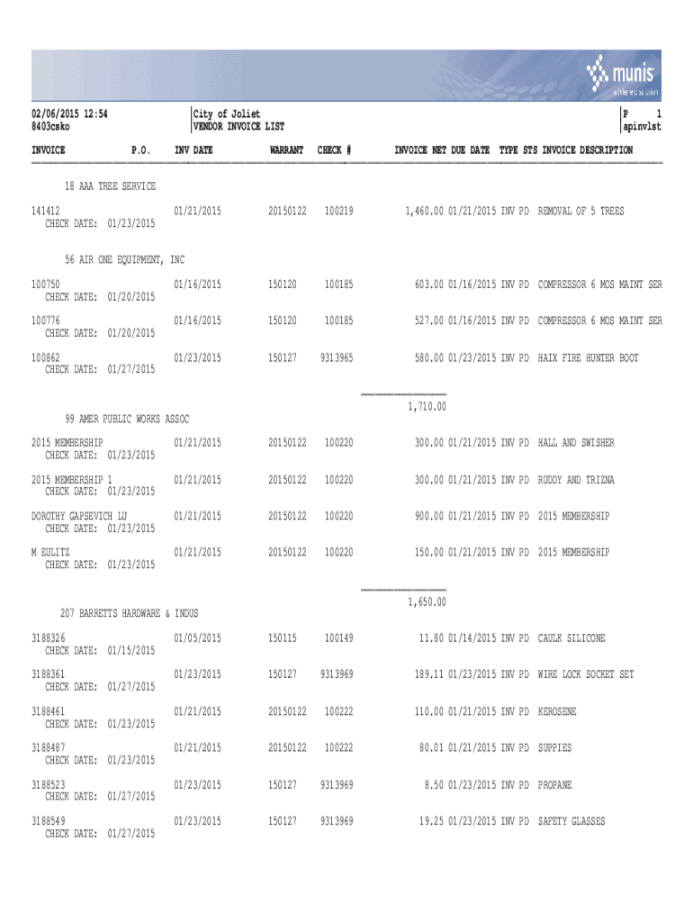 02/06/2015 12:54 8403csko City of Joliet VENDOR INVOICE LIST P 1 apinvlstINVOICE P.O. IN DATE WARRANT CHECK # INVOICE NET DUE DATE TYPE STS INVOICE DESCRIPTION 18 AAA TREE SERVICE 141412 CHECK DATE:01/21/2015201501221002191,460.00