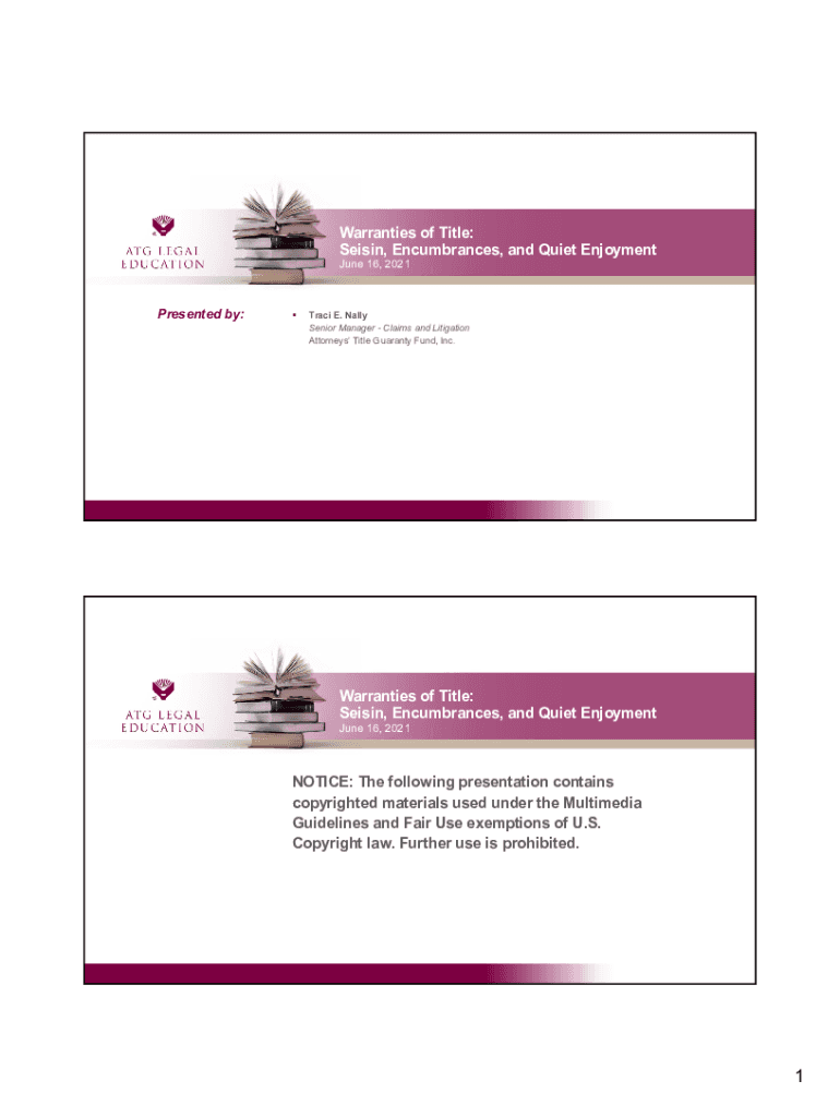 Traci Ally ATG ChampaignWarranties of Title: Basin, Encumbrances, and Quiet Enjoyment June 16, 2021Presented by:Traci E. Ally Senior Manager Claims and Litigation Attorneys Title Guaranty Fund, Inc.