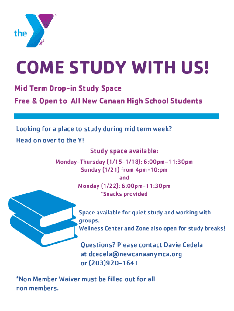 COME STUDY WITH US! Mid-Term Drop in Study Space Free & Open to All New Canaan High School Students Looking for a place to study during midterm week? Head on over to the Y! Study space available: