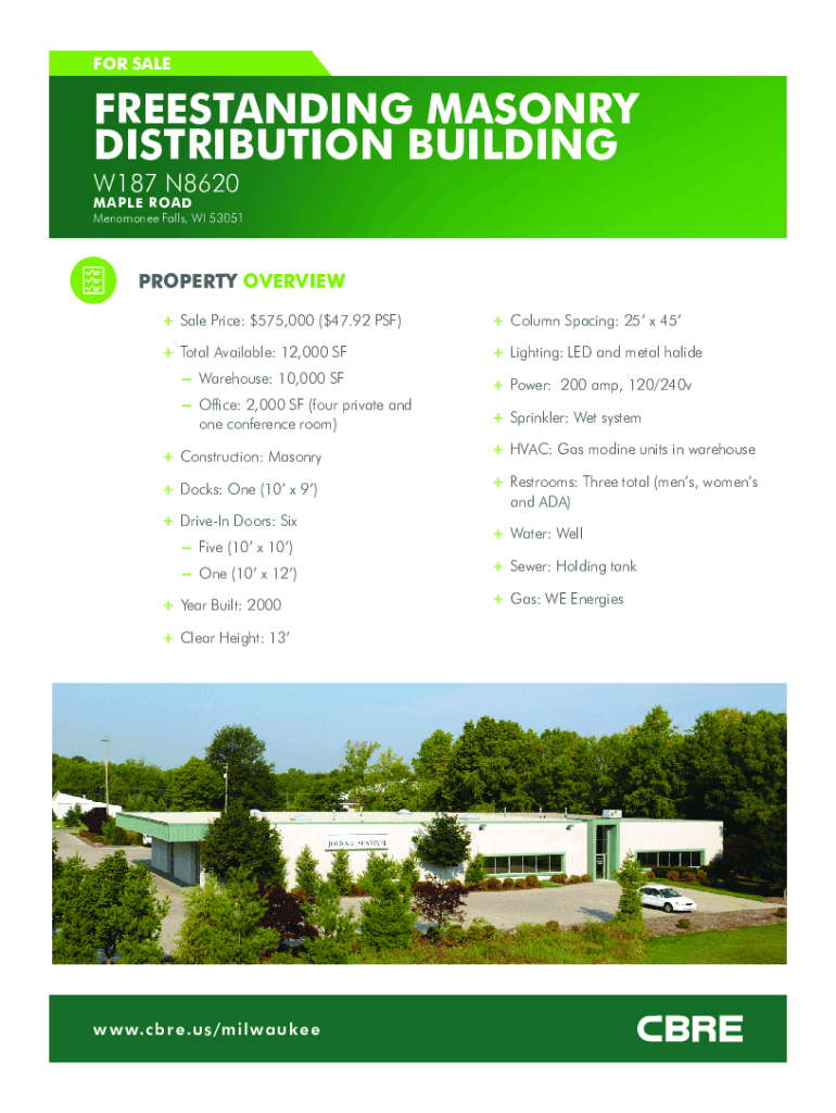 FOR SALEFREESTANDING MASONRY DISTRIBUTION BUILDING W187 N8620 MAPLE ROADMenomonee Falls, WI 53051PROPERTY OVERVIEW ++ Sale Price: $575,000 ($47.92 PSF)++ Column Spacing: 25 × 45++ Total Available: