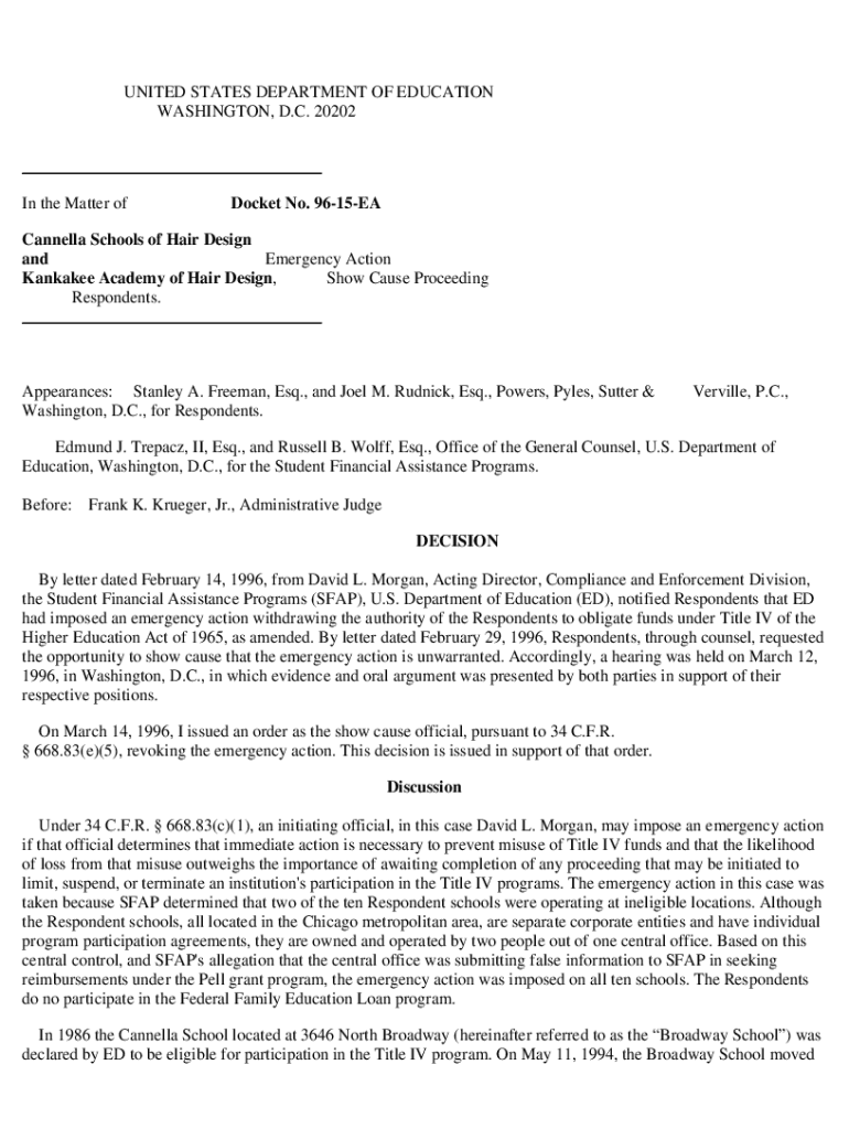 UNITED STATES DEPARTMENT OF EDUCATION WASHINGTON, D.C. 20202 In the Matter docket No. 9615EACannella Schools of Hair Design and Emergency Action Kankakee Academy of Hair Design, Show Cause Proceeding